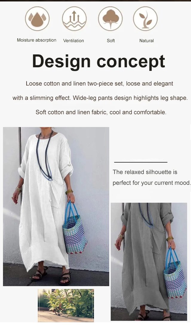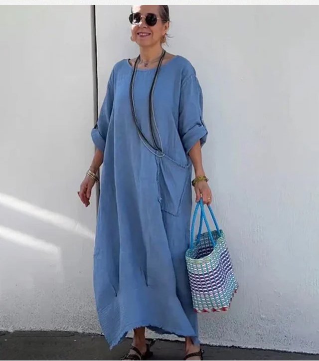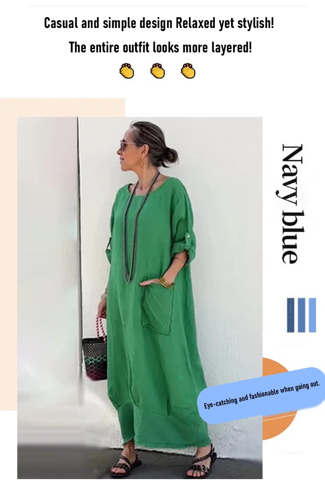 Cotton Linen Casual Solid Color Pocketed Round Neck Long Jumpsuit